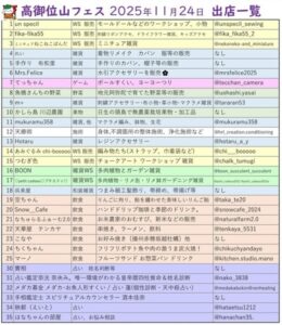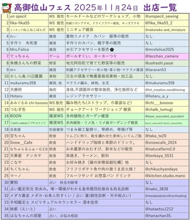 高御位山フェス出店者 2025年11月14日 WRITER ねこえもん この記事を書いている人 - WRITER - ねこえもん 高砂生まれの高砂育ち。猫好きのAB型男子。 お祭りやイベントが大好物です。 高砂の地元ネタをゆる~く発信していきます! 詳しいプロフィールはこちら この記事を書いている人 - WRITER - ねこえもん 高砂生まれの高砂育ち。猫好きのAB型男子。 お祭りやイベントが大好物です。 高砂の地元ネタをゆる~く発信していきます! 詳しいプロフィールはこちら 関連記事 - Related Posts - 荒井町にできた和食屋『くずし料理ごとう』で絶品コースランチ!お昼からプチ贅沢してきた! 縁の下の力持ち!造園・緑地管理・清掃のことなら荒井町にある株式会社トクラにお任せ! 【2024~2025】高砂市内の商業施設やスーパーの年末年始の休業日・営業時間を調べてみた! 高砂市新市長、都倉市長が本日初登庁されました! 最新記事 - New Posts - 【悲報】鹿嶋神社参道にある老舗の花屋さん『冨士原園芸店』が閉店しているみたい…。 高砂市陸上競技場で秋のウォーキングイベント『歩こう 走ろう 陸上競技場!』が開催! 米田町に韓国肌管理専門店『WHITE AQUA 加古川店』がオープンしてるみたい! 中筋にある高砂西部病院で『健康祭』が復活開催!全国各地からの徳洲会物産展は必見! - Comments - コメントをキャンセルメールアドレスが公開されることはありません。 ※ が付いている欄は必須項目ですコメント ※ 名前 ※ メール ※ サイト 次回のコメントで使用するためブラウザーに自分の名前、メールアドレス、サイトを保存する。