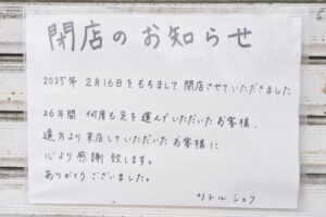 リトルシェフ閉店のお知らせ 2025年4月18日 2025年4月28日 WRITER ねこえもん この記事を書いている人 - WRITER - ねこえもん 高砂生まれの高砂育ち。猫好きのAB型男子。 お祭りやイベントが大好物です。 高砂の地元ネタをゆる~く発信していきます! 詳しいプロフィールはこちら この記事を書いている人 - WRITER - ねこえもん 高砂生まれの高砂育ち。猫好きのAB型男子。 お祭りやイベントが大好物です。 高砂の地元ネタをゆる~く発信していきます! 詳しいプロフィールはこちら 関連記事 - Related Posts - 大丈夫?高砂市の個人情報管理…尼崎USB紛失受け全庁調査したらとんでもない結果に! 阿弥陀町魚橋にオープンした『Curry&Cafe るぅ~む』でイチ押しジビエカレーを食べてきた! 松陽にある大人気のカフェ『bird street+』でチキンバタースパイスカレーを食べてきた! 高砂市まちの観光会館『結びん』がプチリニューアル!お買い物やまち歩きの休憩に! 最新記事 - New Posts - 高砂名所や名物も候補に!まるごと東はりま『みんなのイチ推しグランプリ 2025』が開催中! 高砂市文化会館で『たかさご市社協ふれあいフェスタ2025』が今年も開催されます! 鹿嶋神社参道で周遊型謎解き体験イベント『参道巡りの謎解き探訪』が開催されます! ヴィクトリーナ姫路の試合会場で『高砂魅力発見PRブース』設置。観戦割引チケット情報も! - Comments - コメントをキャンセルメールアドレスが公開されることはありません。 ※ が付いている欄は必須項目ですコメント ※ 名前 ※ メール ※ サイト 次回のコメントで使用するためブラウザーに自分の名前、メールアドレス、サイトを保存する。